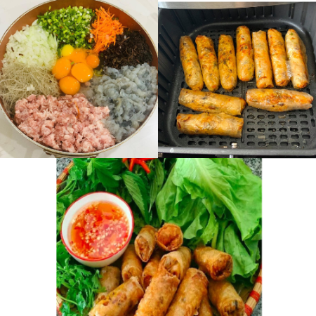 + Sau khi nồi đã nóng, hãy xếp nem vào nồi. Sau đó chọn nhiệt 180 độ trong vòng 15 phút, vậy là anh chị sẽ có đĩa nem thơm ngon, giòn rụm.