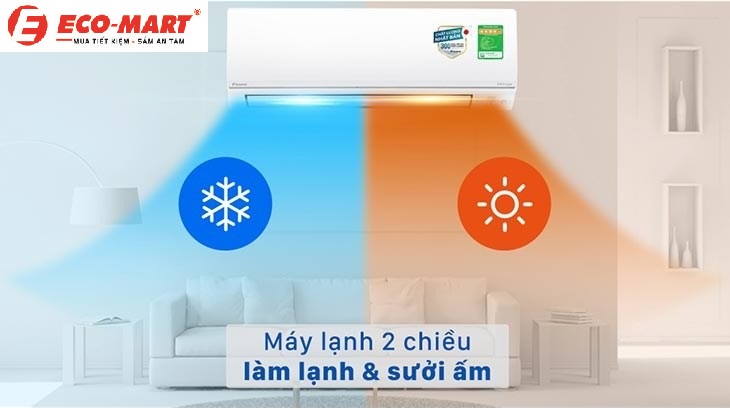 Giống với điều hòa 1 chiều đều có khả năng làm mát, nhưng điều hòa 2 chiều là loại máy có khả năng thay đổi nhiệt độ trong phòng như mong muốn để thích nghi với thời tiết cả nóng và lạnh. Nói đơn giản điều hòa không khí 2 chiều sẽ giảm nhiệt độ để làm mát căn phòng khi thời tiết nóng lên và đẩy nhiệt độ lên để sưởi ấm căn phòng như một thiết bị sưởi khi thời tiết trở lạnh.