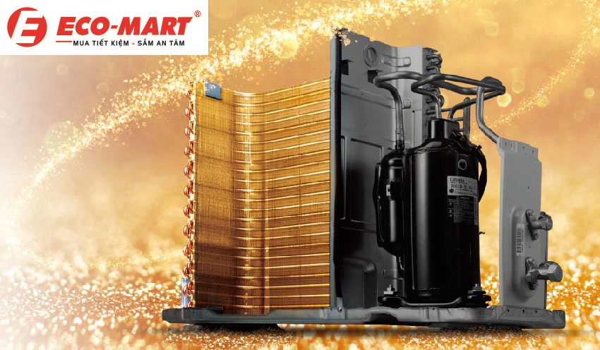 Dàn nóng cánh tản nhiệt được phủ lớp màu vàng giúp gia tăng tuổi thọ cho sản phẩm và đảm bảo độ bền cao. Lớp phủ màu vàng này không chỉ làm tăng tính thẩm mỹ mà còn có chức năng chống ăn mòn, giúp dàn nóng hoạt động ổn định và bền bỉ theo thời gian.