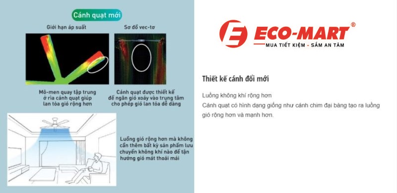 Thiết kế cánh quạt được cải tiến giúp tăng tốc độ vòng quay và phân tán gió đều trên toàn bộ phòng. Tính năng này giúp giảm tiếng ồn và tiết kiệm năng lượng đáng kể, mang lại không gian sống sạch sẽ và thoải mái.