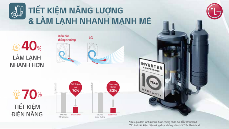 Máy nén Dual Inverter của LG sử dụng mô tơ kép giúp máy nén hoạt động linh hoạt hơn, tiết kiệm điện tới 70% so với điều hòa thông thường. Sản phẩm đạt nhãn năng lượng 5 sao với CSPF 5.07 – thuộc nhóm tiết kiệm điện hàng đầu hiện nay.