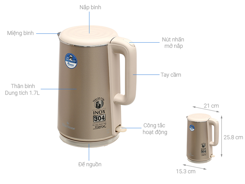 - Dung tích 1.7 lít, mâm nhiệt inox 304 và công suất 1800 - 2150W đun nước nhanh sôi.