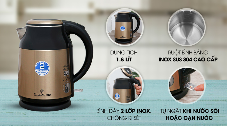 1.6. Nhiều tiện ích: Bên cạnh đó bình siêu tốc BlueStone còn được trang bị mâm nhiệt to và phẳng giúp đun nước nhanh sôi; đế tiếp điện Strix cao cấp được sản xuất tại Anh với độ bền cao; đèn báo hiệu; thang chia mực nước; tự động ngắt điện khi ấm cạn nước / nước sôi…
