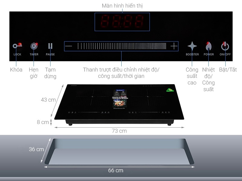 Bếp được thiết kế theo dạng bếp từ đôi tinh gọn, có thể lắp âm hoặc lắp dương tùy theo bố cục bếp.