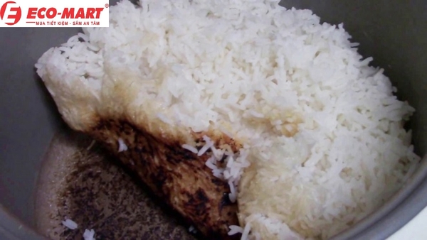 Nguyên nhân do gạo kém chất lượng,hoặc khi nấu cho lượng nước ít hơn lượng gạo hoặc mâm nhiệt gặp sự cố cũng sẽ bị.