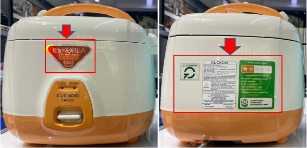 - Hàng Cuckoo thật có lớp sơn bên ngoài màu sắc đẹp, tinh xảo với nhãn hiệu "It's KOREA", mã vạch, tem phụ, tem bảo hành, tem hợp quy, tem cảnh báo, tem hướng dẫn sử dụng và xuất xứ sản phẩm, logo màu chủ đạo xám đen đúng chuẩn quy định.