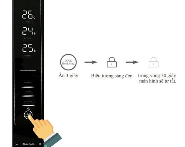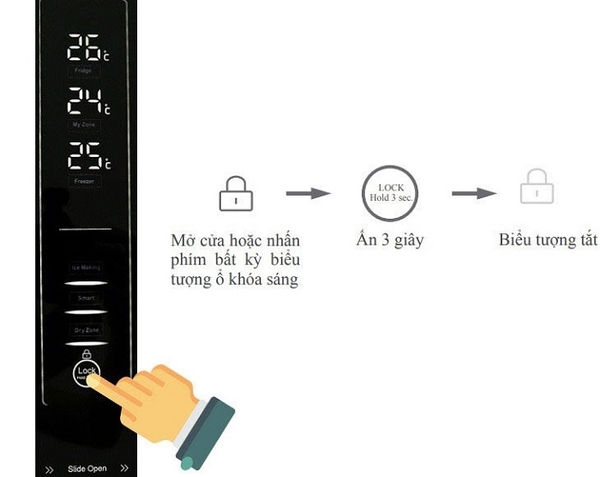 • Bước 1: Mở cửa tủ lạnh hoặc nhấn phím bất kỳ để biểu tượng ổ khóa sáng đèn.