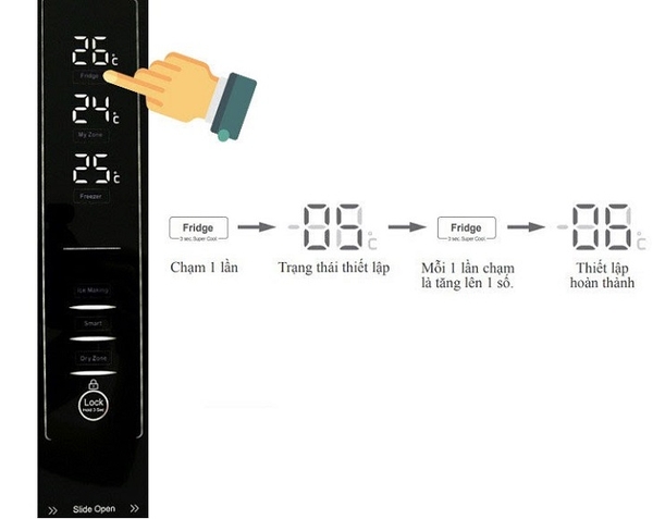 Trên ngăn lạnh các bạn nên để nhiệt độ trong khoảng từ 9 – 1 độ. Bạn cũng có thể tùy chỉnh nhiệt độ theo ý mình. Các bạn có thể điều chỉnh nhiệt độ ngăn lạnh theo hướng dẫn sau: