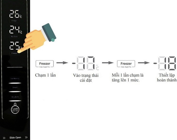 • Bước 2: Tiếp tục nhấn phím Freezer để điều chỉnh nhiệt độ tương ứng từ -15 đến -24 độ C.