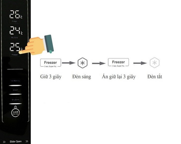 • Nhấn phím Freezer và giữ khoảng 3 giây. Khi thấy tiếng bíp phát ra và biểu tượng làm lạnh nhanh sáng đèn, thì lúc này chức năng làm đông nhanh Super Freezer được kích hoạt.