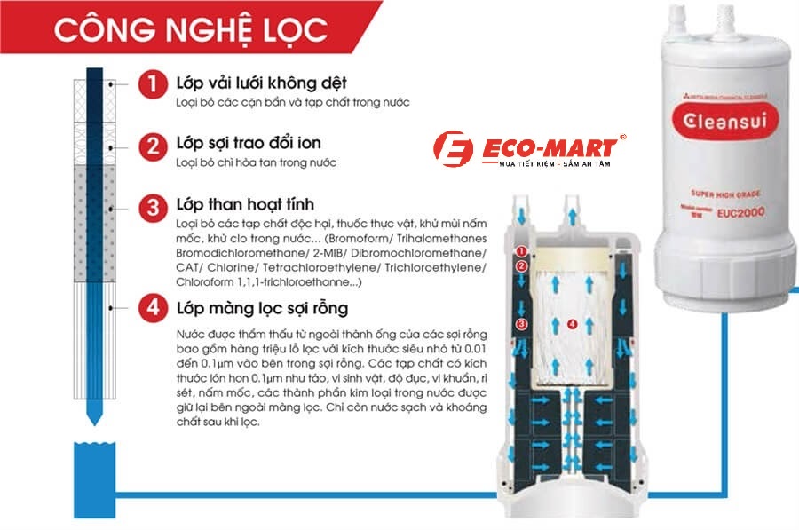 Cấu tạo 4 tầng lọc của lõi lọc nước tạo ion kiềm Mitsubishi Cleansui EU301
