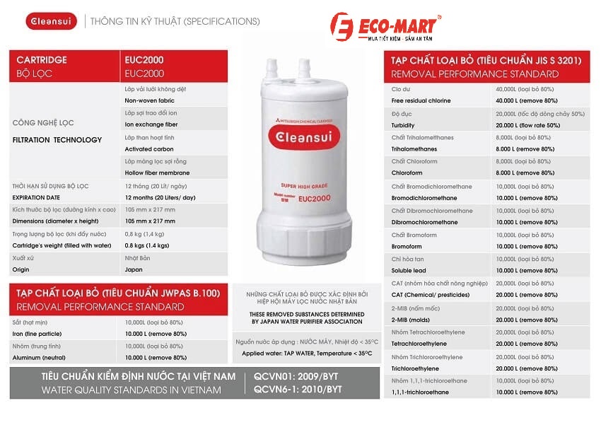 Máy lọc Mitsubishi Cleansui EU301 loại bỏ được 15 tạp chất theo quy định của JIS và JWPA