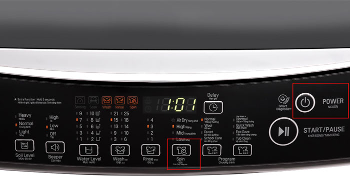 – Đối với các máy giặt LG không có nút Air Dry riêng thì để bật chế độ hong khô, bạn chỉ cần nhấn giữ nút Spin (vắt) trong 3 giây.