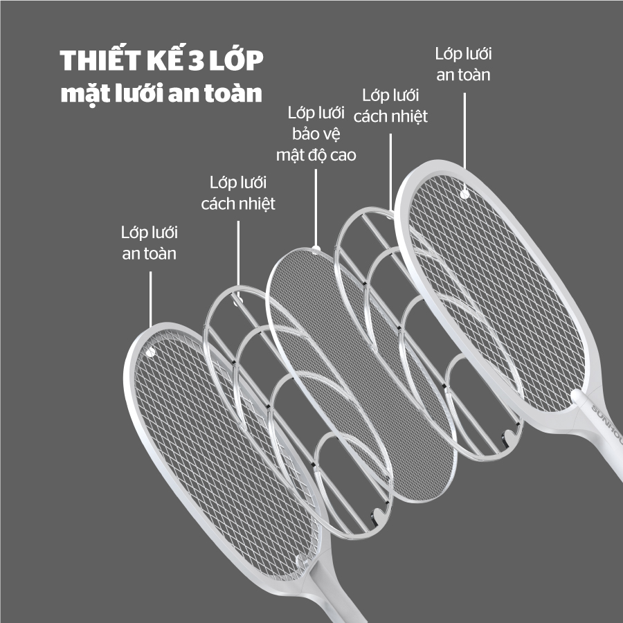 - Vợt bắt muỗi được thiết kế 3 lớp lưới điện đan khít: