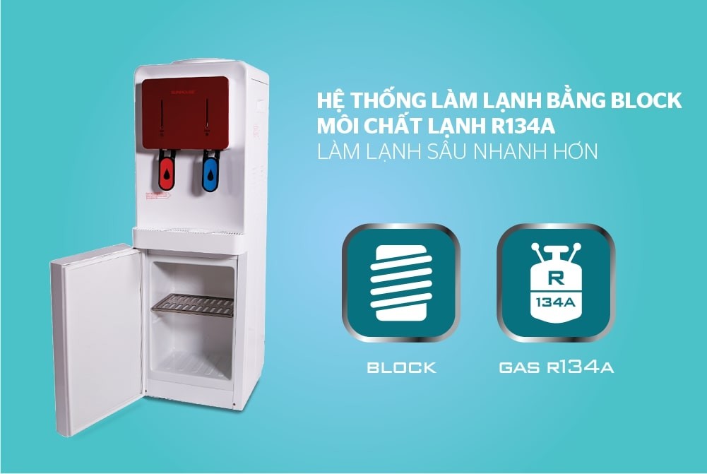 - Cây nước này dùng công nghệ làm lạnh bằng Block: nước được làm lạnh bằng Gas và hạ nhiệt độ nước xuống từ 2 - 10 độ C, máy hoạt động có độ bền cao, tiết kiệm điện, cung cấp nước lạnh liên tục Phù hợp đặt ở gia đình, văn phòng,....