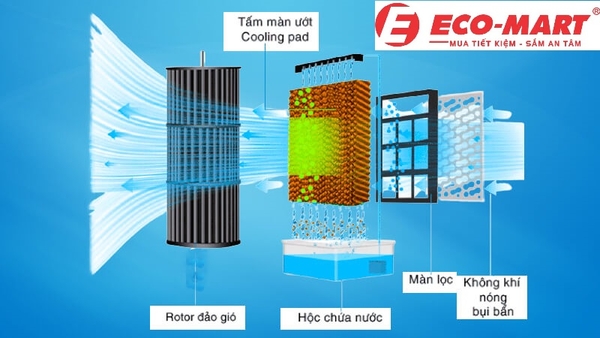 + Hơi nóng sẽ được quạt hút vào đi qua tầm làm mát. Tấm làm mát được làm bằng chất liệu gỗ hoặc bằng nhựa hay bàng kết hợp gỗ nhựa được thiết kế thành các rãnh đan xen. Nước được bơm lên tấm làm vfi vậy tám này được làm ướt, không khí nóng đi qua sẽ diễn ra hiện tượng trao đổi nhiệt và tạo ra độ ẩm, quạt sẽ thổi gió mát cùng hơi nước làm không khí mát lành hơn