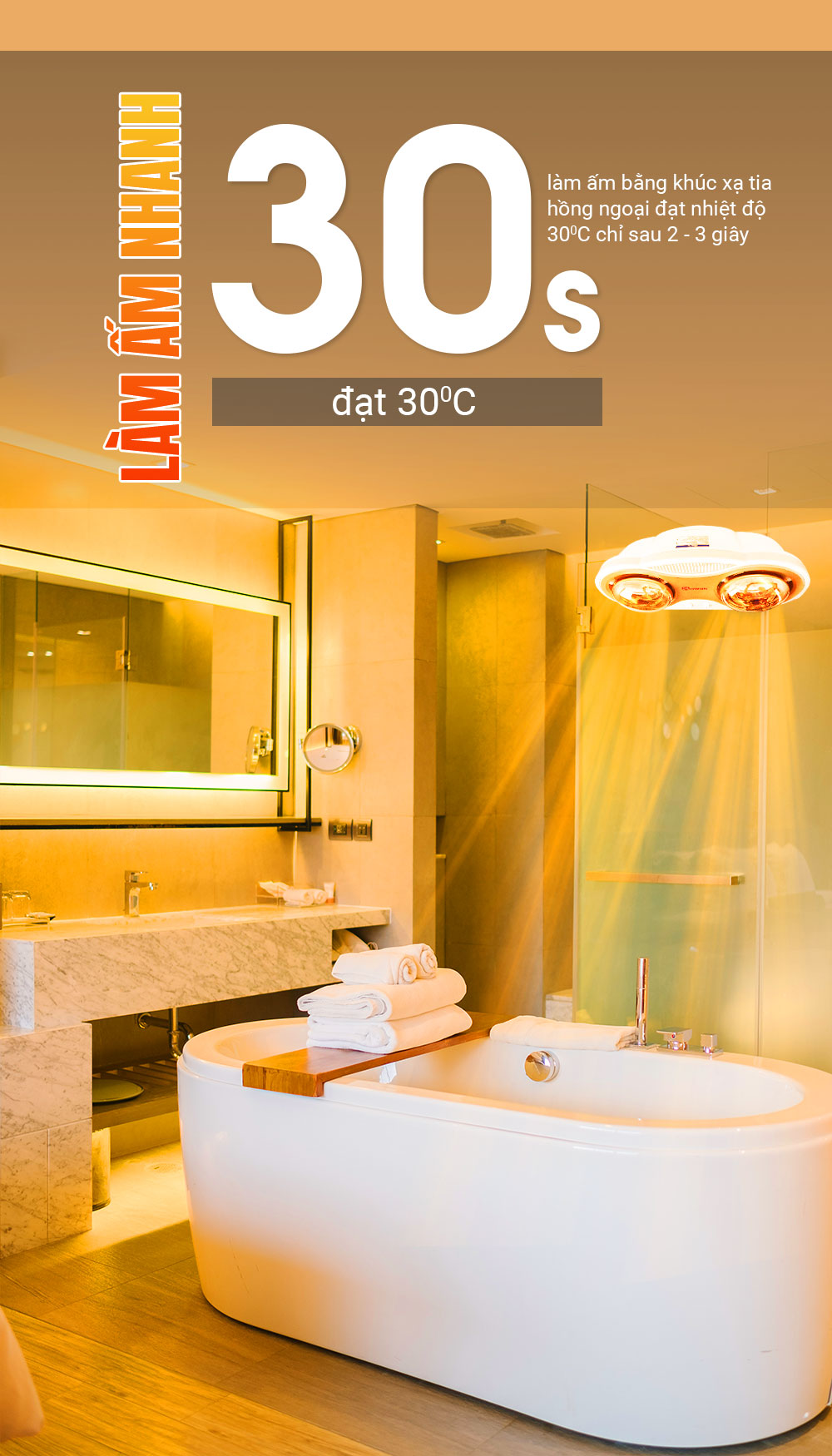 - Công dụng chính của đèn sưởi nhà tắm là làm ấm nhanh và giữ nhiệt độ ổn định trong phòng tắm.