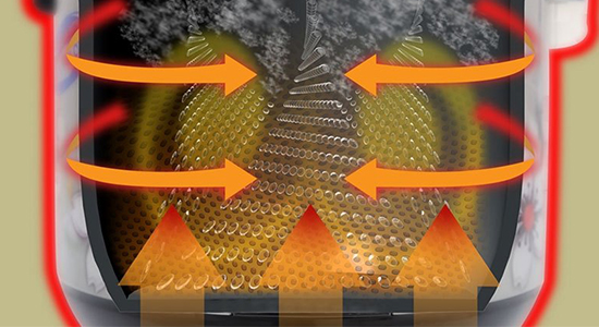 -Công nghệ nấu 3D là sự nâng cấp tiếp theo, với mâm nhiệt được đặt không chỉ ở đáy và các bên cạnh của nồi mà còn cả ở phần nắp nồi. Điều này mang lại việc nhiệt được phân phối rộng rãi và đều đặn hơn.