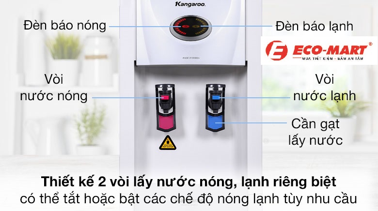 Cây nước Có 2 vòi riêng biệt cho nước nóng và lạnh, với đèn báo hiệu nhiệt độ và 2 công tắc nguồn riêng biệt, cho phép bạn kiểm soát chính xác và tùy chỉnh theo nhu cầu sử dụng của mình.