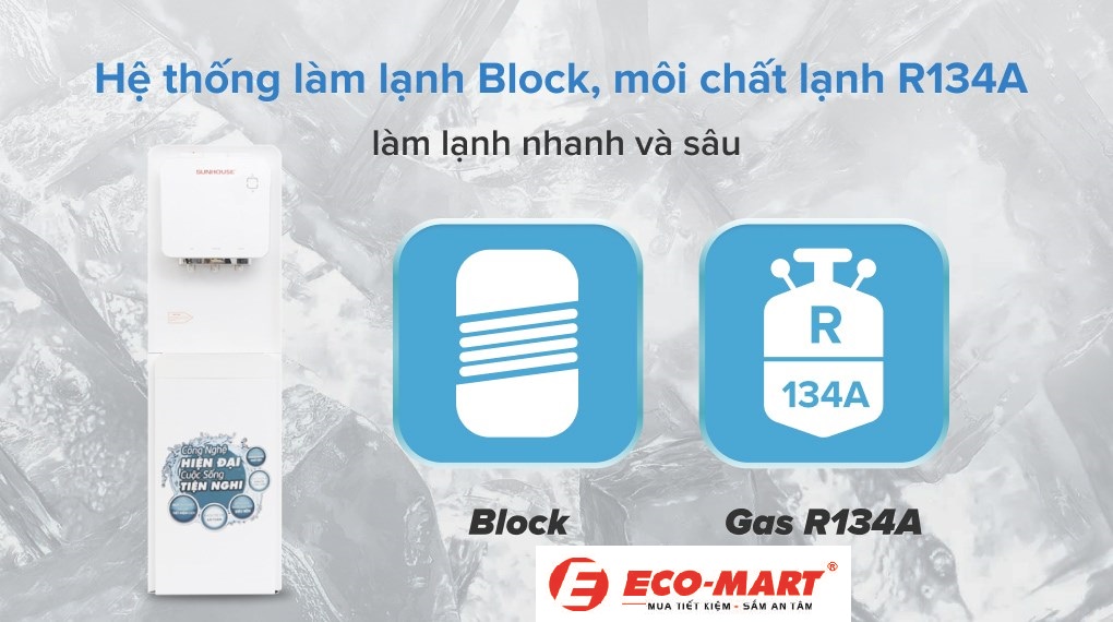 Cây nước nóng lạnh Sunhouse sử dụng môi chất R134A giúp làm lạnh nước sâu hơn, đồng thời tiết kiệm điện năng hơn. Bình chứa nước được làm bằng chất liệu inox bền tốt, giúp giảm tối đa tình trạng đóng cặn cho nước và tăng độ bền cho cây nước.