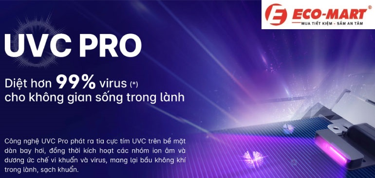 Để bảo vệ sức khỏe, máy lạnh Aqua sử dụng công nghệ UVC Pro khử khuẩn bằng tia cực tím. Công nghệ này tiêu diệt tới 99% virus trong không khí, tạo ra không gian sạch sẽ và an toàn cho người dùng.