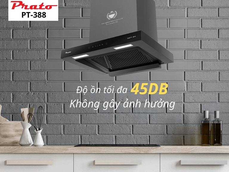 Với công suất hút lớn nhưng máy hút mùi Prato PT-388.H1 vẫn đảm bảo khả năng vận hành êm ái với độ ồn tối đa chỉ 45dB. Đây là mức độ ồn thấp, không gây ảnh hưởng đến sinh hoạt và trò chuyện trong bếp. So với nhiều mẫu máy hút mùi khác, Prato PT-388.H1 hoạt động rất êm, giúp bạn có trải nghiệm nấu nướng thoải mái mà không bị làm phiền bởi tiếng động lớn.