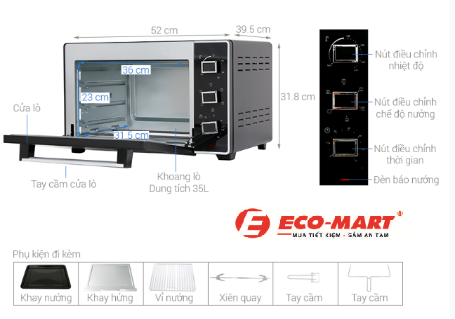 Dung tích: Với dung tích 35 lít, lò đủ lớn để phục vụ gia đình 4-6 người. Lò có thể nướng bánh, quay gà nguyên con tới 1.5 kg hoặc nướng thịt cỡ lớn mà không gặp khó khăn.