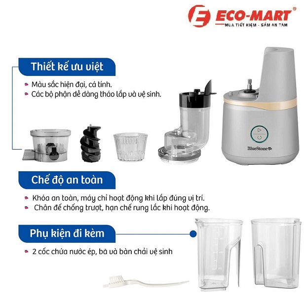 Bluestone SJB-6558 là máy ép chậm nổi bật trong phân khúc gia đình nhờ thiết kế sang trọng, công nghệ tiên tiến và khả năng ép đa dạng nguyên liệu. Với mục tiêu mang đến nước ép tinh khiết và giữ nguyên dưỡng chất, sản phẩm này đã thu hút sự chú ý của nhiều người dùng. Hãy cùng siêu thị điện máy Eco-Mart khám phá những đặc điểm nổi bật của Bluestone SJB-6558 qua bài đánh giá chi tiết sau đây.