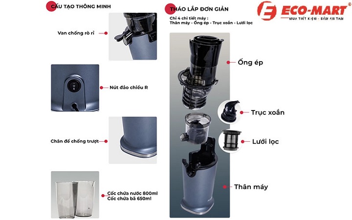- Trục ép: Được chế tạo từ chất liệu an toàn, bền bỉ, trục ép xoay chậm để chiết xuất nước hiệu quả.