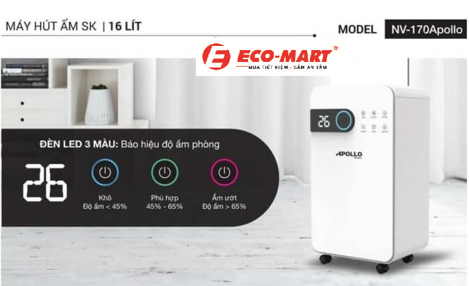 Máy hút ẩm APOLO SUMIKURA NV-170APOLO 16 lít/ngày là một sản phẩm phù hợp với nhu cầu hút ẩm cho những không gian vừa và nhỏ, như phòng ngủ, phòng khách hoặc văn phòng. Với khả năng hút ẩm hiệu quả, hoạt động êm ái, và các tính năng thông minh như tự động điều chỉnh độ ẩm, tự ngắt khi đầy nước, máy mang lại sự tiện lợi và an toàn cho người sử dụng. Mức giá hợp lý và thiết kế hiện đại cũng là những yếu tố khiến máy hút ẩm này trở thành một lựa chọn tốt trong phân khúc giá tầm trung.