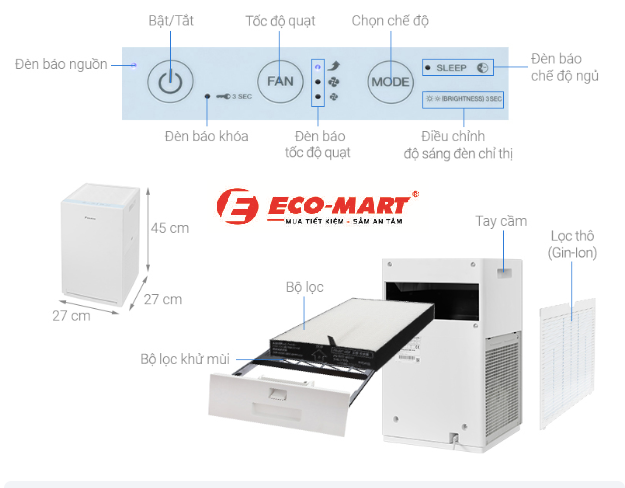 Ionizer: Máy cũng trang bị chức năng phát ion âm giúp kết hợp và làm nặng các hạt bụi, tạo điều kiện cho chúng dễ dàng bị loại bỏ.