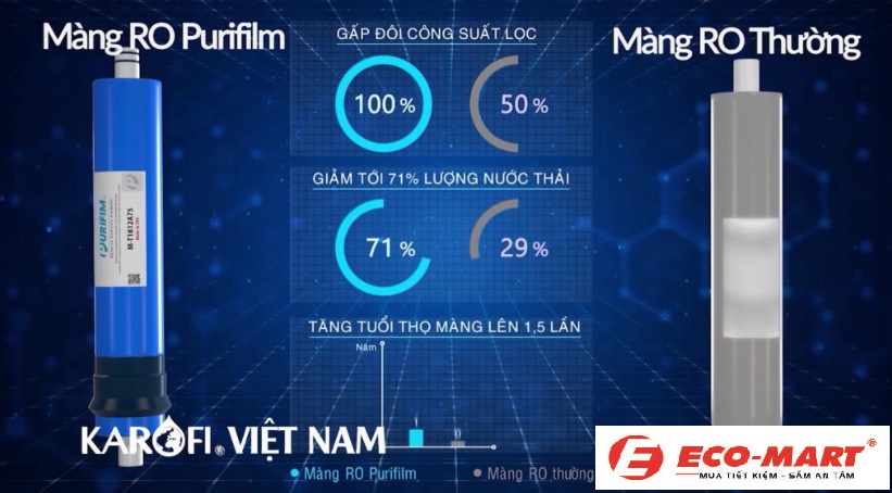- + Máy lọc nước Karofi KAQ-U05 được trang bị màng Ro Purifim đúc nguyên khối nhập khẩu từ Mỹ, giúp loại bỏ 99,9% các ion kim loại nặng, vi sinh vật, vi khuẩn, các độc tố có trong nước… làm cho nước tinh khiết hoàn toàn.