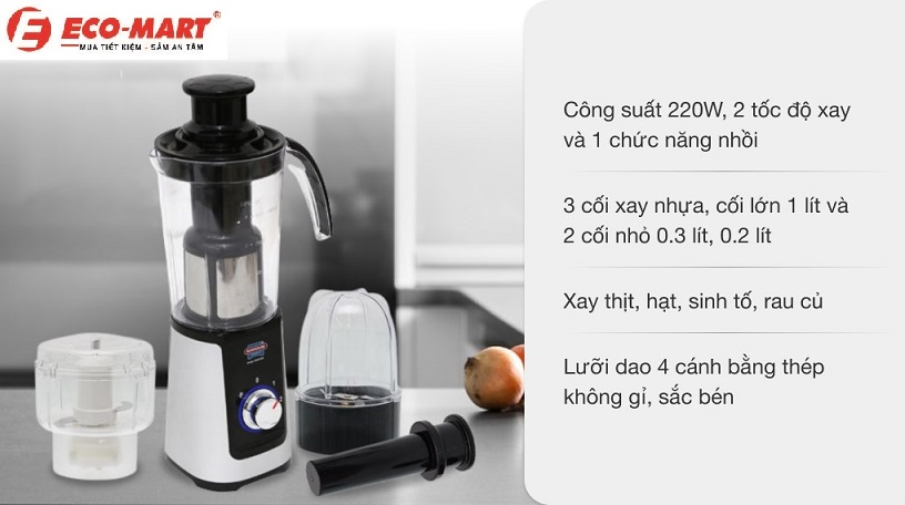 - Công suất 220W phù hợp cho nhu cầu cơ bản, nhưng sẽ hạn chế nếu xay thực phẩm cứng như đá viên.