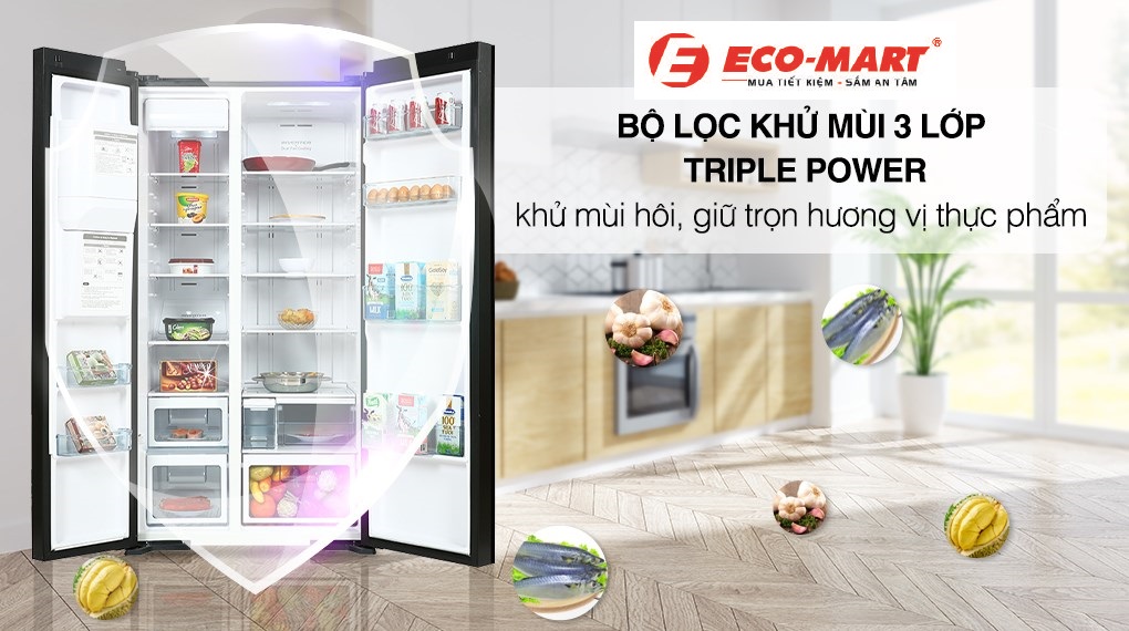 Bộ lọc Triple Power với 3 lớp bảo vệ đảm bảo an toàn cho thực phẩm và sức khỏe gia đình. Vi khuẩn, mùi hôi và các tác nhân gây hại khác sẽ được loại bỏ hoàn toàn, tạo không gian lưu trữ sạch sẽ và an toàn hơn cho thực phẩm.