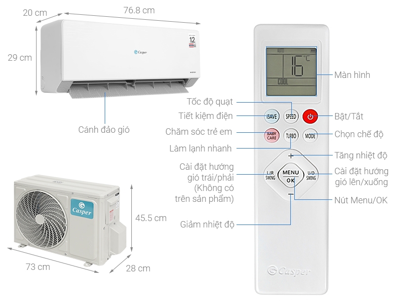 Với điều khiển điều hòa Casper bạn dễ dàng điều chỉnh, cài đặt các chế độ. Màn hình LED nút bấm nổi kèm chú thích rất rõ ràng, vô cùng tiện ích.