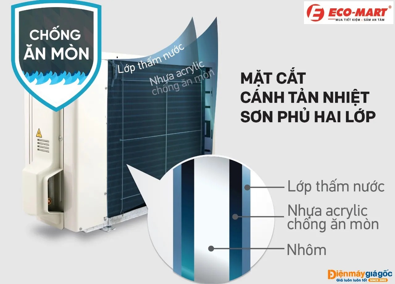Dàn tản nhiệt được thiết kế chịu được mọi sự tác động của thời tiết, giúp máy điều hòa hoạt động ổn định và hiệu quả trong mọi điều kiện khí hậu khắc nghiệt. Lớp sơn chống gỉ bên ngoài cũng giúp máy hạn chế sự ăn mòn từ thời tiết.