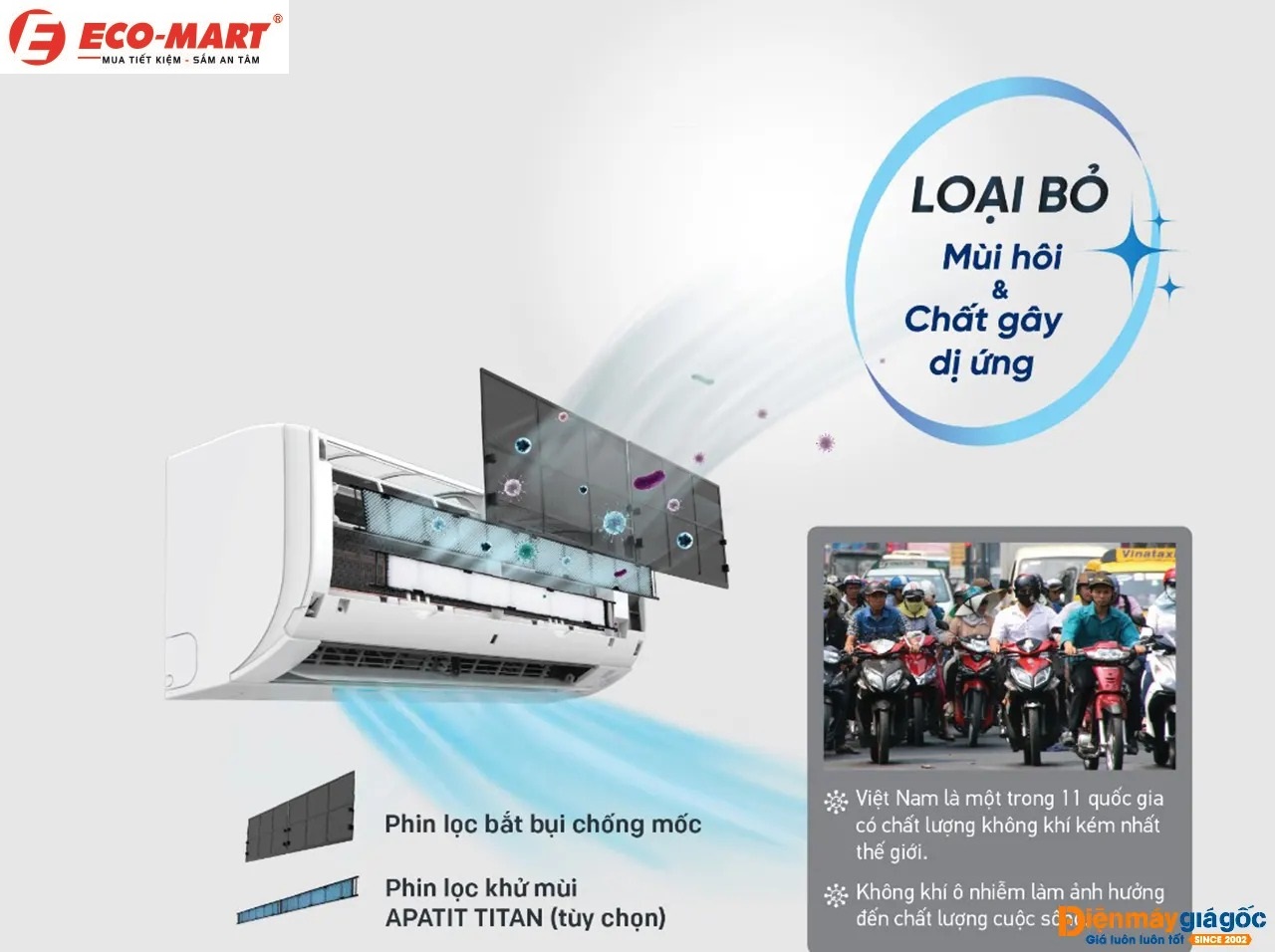 Hệ thống lọc không khí tiên tiến trên Điều Hòa Daikin FTF50XV1V/RF50XV1V bao gồm phin lọc xúc tác Apatit Titan, loại bỏ bụi bẩn, mùi hôi và các chất khí độc hại trong không gian sống, đảm bảo sức khỏe cho người dùng.