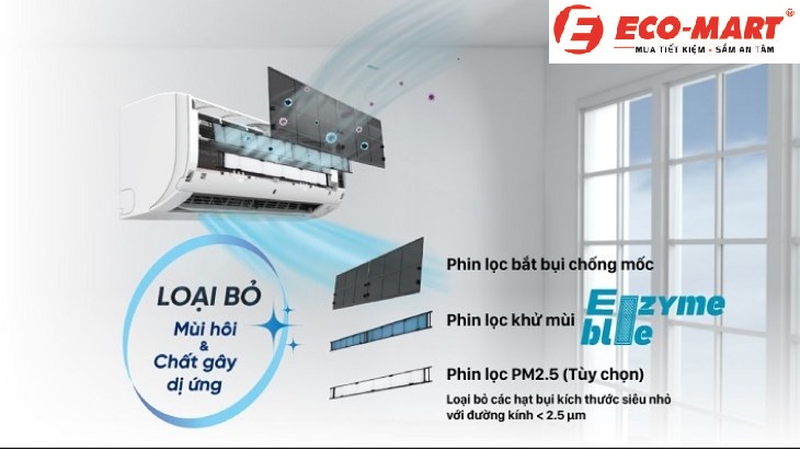 Với 2 lớp lọc trên thì sẽ có thể loại bỏ các tác nhân gây mùi, vi khuẩn, nấm mốc, các chất gây dị ứng và cả bụi mịn PM2.5. Giúp không khí trong sạch hơn trong phòng của bạn.