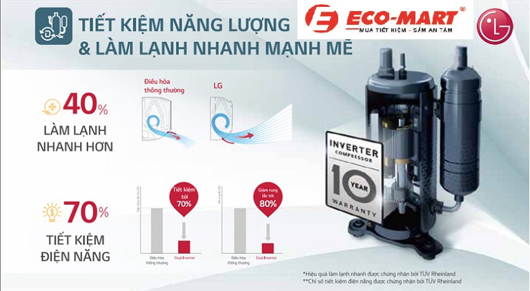 Điều hòa LG 18000Btu V18WIN1 không chỉ đảm bảo hiệu suất làm mát cao mà còn tiết kiệm điện năng thông qua công nghệ Inverter tiên tiến. Thiết kế thông minh và công nghệ hiện đại giúp máy điều chỉnh mức tiêu thụ năng lượng linh hoạt, phù hợp với nhu cầu thực tế của không gian sống. Công nghệ Inverter giúp duy trì nhiệt độ mong muốn mà không cần hoạt động ở công suất tối đa liên tục, giảm tần suất bật/tắt máy và tiết kiệm đến 70% lượng điện tiêu thụ so với các dòng máy không sử dụng Inverter. Đồng thời, ổn định trong hoạt động giúp kéo dài tuổi thọ của máy.