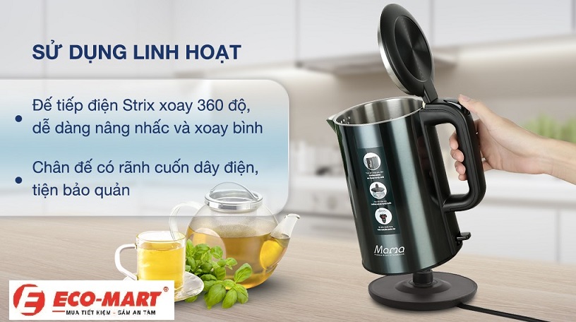 Không giống như nhiều mẫu ấm truyền thống, Sunhouse SHD1389 được thiết kế với đế xoay 360 độ linh hoạt. Điều này giúp việc đặt và nhấc ấm trở nên dễ dàng hơn, phù hợp với mọi góc độ sử dụng, đồng thời tăng tính tiện lợi cho người dùng.