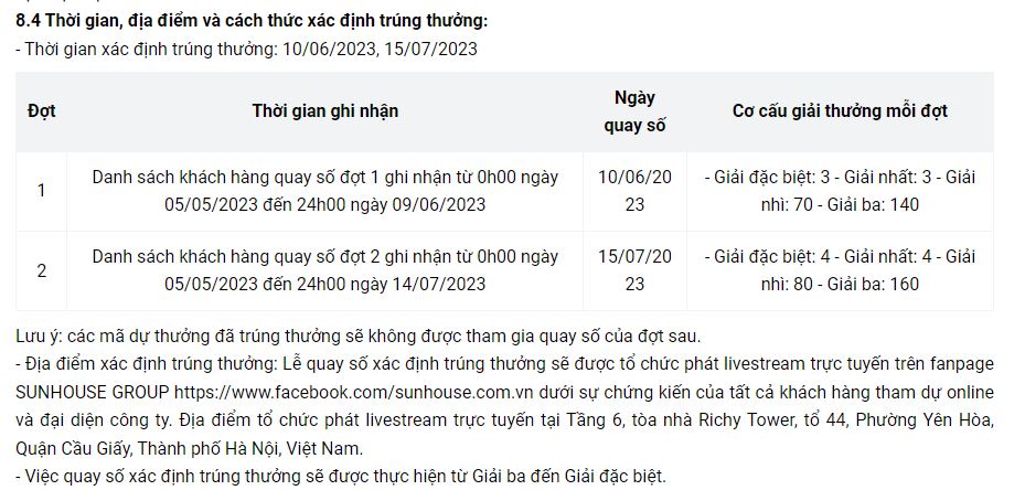 - Đối với những giải thường không có người trúng thưởng, Công ty Cổ phần Tập đoàn SUNHOUSE phải có trách nhiệm trích nộp bằng tiền mặt 50% giá trị đã công bố của giải thưởng đó vào Ngân sách nhà nước theo quy định pháp luật.