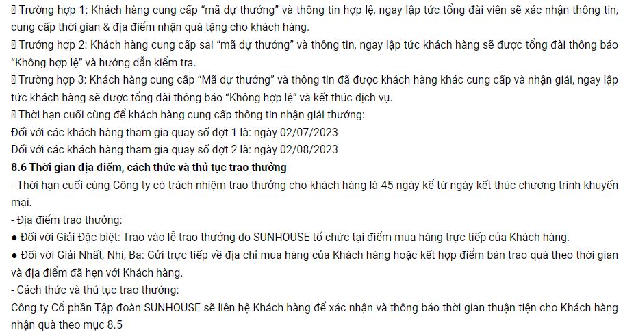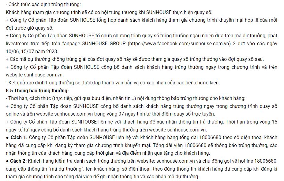 - Công ty Cổ phần Tập đoàn SUNHOUSE có trách nhiệm thông báo kết quả cho người trúng thưởng. Danh sách khách hàng trúng thưởng được công bố chính thức trên website công ty sunhouse.com.vn.