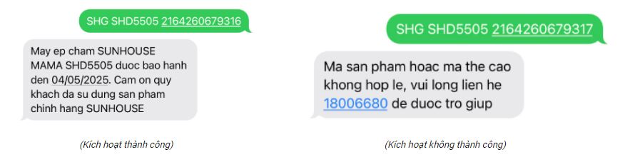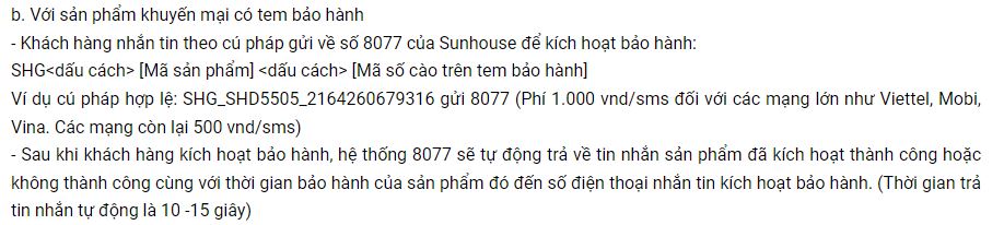 - Khi kích hoạt bảo hành thành công qua SMS SUNHOUSE, hệ thống SUNHOUSE tự động ghi nhận mã số kích hoạt bảo hành là mã số dự thưởng.