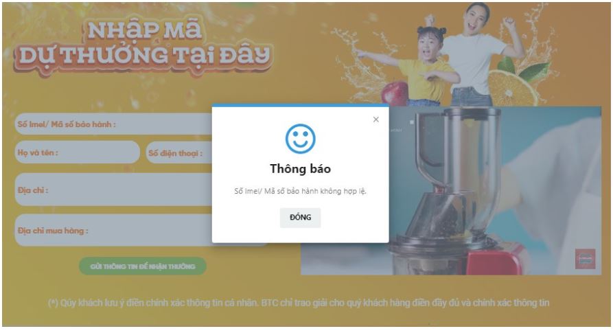 • Trưởng hợp 2: Khách hàng cung cấp “mã số dự thưởng” và thông tin không hợp lệ, ngay lập tức khách hàng sẽ nhận được thông báo “Số imei/Mã số bảo hành không hợp lệ”, khách hàng kiểm tra và nhập lại các trường thông tin cho hợp lệ.