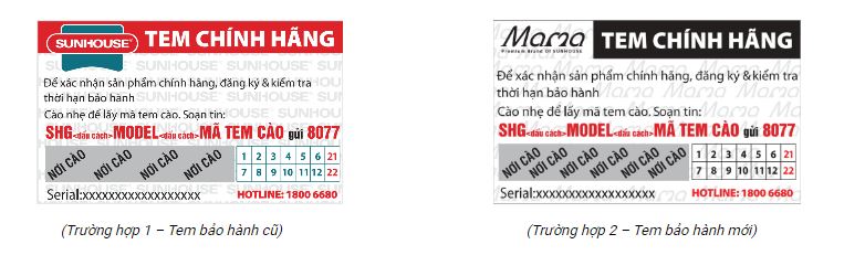 • Với sản phẩm có tem bảo hành: tem bảo hành được dán trên sản phẩm có 1 lớp phủ bạc (Theo 2 trường hợp Tem bảo hành mới và Tem bảo hành cũ – như hình minh họa dưới đây). Cào nhẹ lớp bạc để nhận được 1 dãy mã số.