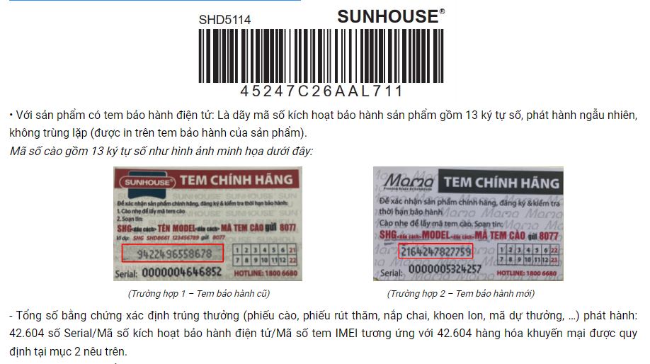 Lưu ý: Mã dự thưởng hợp lệ là mã số IMEI (được in trên tem IMEI trên mặt cạnh sản phẩm và hộp sản phẩm) khớp với mã số đã được SUNHOUSE phát hành cho sản phẩm thuộc danh sách sản phẩm áp dụng khuyến mại