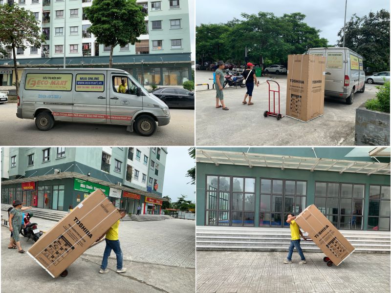 - Tủ lạnh Toshiba được đóng gói kỹ lưỡng và vận chuyển từ kho của ECO-MART đến địa chỉ của chị Mai bằng xe chuyên dụng.
