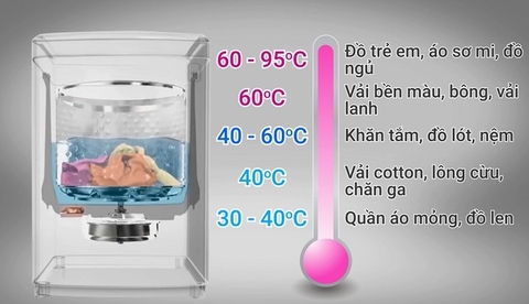 40 - 60°C: Thích hợp cho đồ lót, khăn tắm, nệm và các loại vải có khả năng chịu nhiệt tốt hơn. Nhiệt độ này giúp diệt khuẩn hiệu quả.