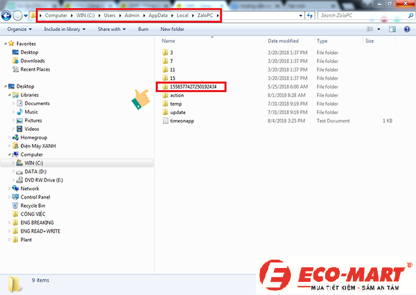 Bước 1: Bạn tìm đến theo đường dẫn sau C:\Users\tên_user\AppData\Local\ZaloPC