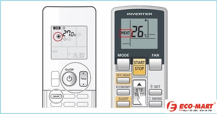 - Bước 1: Bạn nhấn nút MODE trên remote cho tới khi chế độ trên remote chuyển sang chữ HEAT hoặc biểu tượng mặt trời.